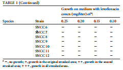 試驗(yàn)細(xì)菌在含有不同濃度左氧氟沙星的基礎(chǔ)培養(yǎng)基上的生長(zhǎng)